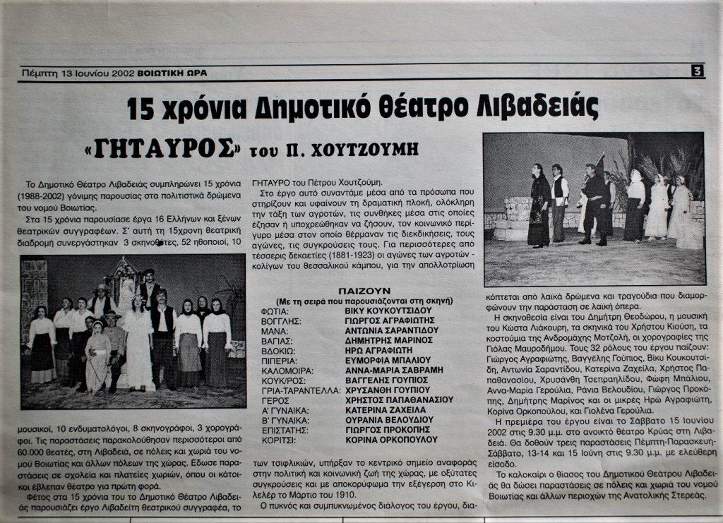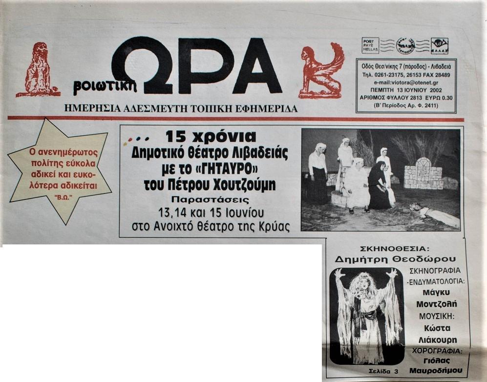 Η πρεμιέρα του έργου έγινε το Σάββατο 15 Ιουνίου 2002 στο ανοιχτό θέατρο της Κρύας.