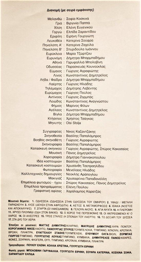 φωνές χορού: Μπολοβίνη Γαρυφαλλιά, Γουργιώτη Ειρήνη, Σούφρα Κατερίνα, Κοσκινά Σοφία, Σαραντίδου Ελπίδα