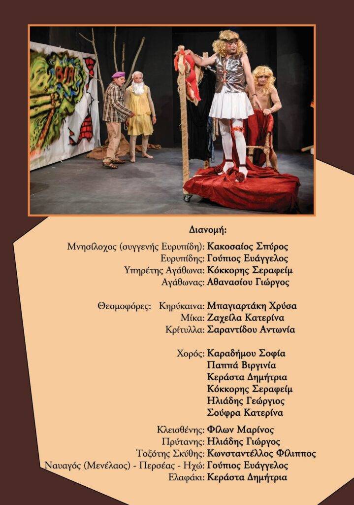 Η τεχνική του «θεάτρου μέσα στο θέατρο» κορυφώνεται και στρέφεται στην παρατραγωδία, καθώς ο Μνησίλοχος συλλαμβάνεται και προσπαθεί να ειδοποιήσει τον Ευριπίδη μιμούμενος ήρωες και ηρωίδες από τα δράματα του ποιητή. Ο Αριστοφάνης χρησιμοποιεί αποσπάσματα από τις τραγωδίες του Ευριπίδη: Παλαμήδης, Ελένη και Ανδρομέδα. Κι ενώ διαλέγεται με την τραγωδία, υπονομεύει τις τραγικές συμβάσεις. Ο Μνησίλοχος μεταμφιέζεται σε Ελένη και ο Ευρυπίδης σε ναυαγό Αγαμέμνωνα, Ηχώ, Ανδρομέδα και τέλος σε γερόντισσα προαγωγό που φέρνει μια αυλητρίδα ελαφάκι για να δελεάσει τον Σκύθη φρουρό. Ό,τι δεν κατόρθωσε η αναπαράσταση των τραγικών σκηνών από το ευριπίδειο corpus και η διακωμώδησή τους, θα το επιτύχει η καταφυγή στο γενετήσιο ένστικτο του βάρβαρου τοξότη.